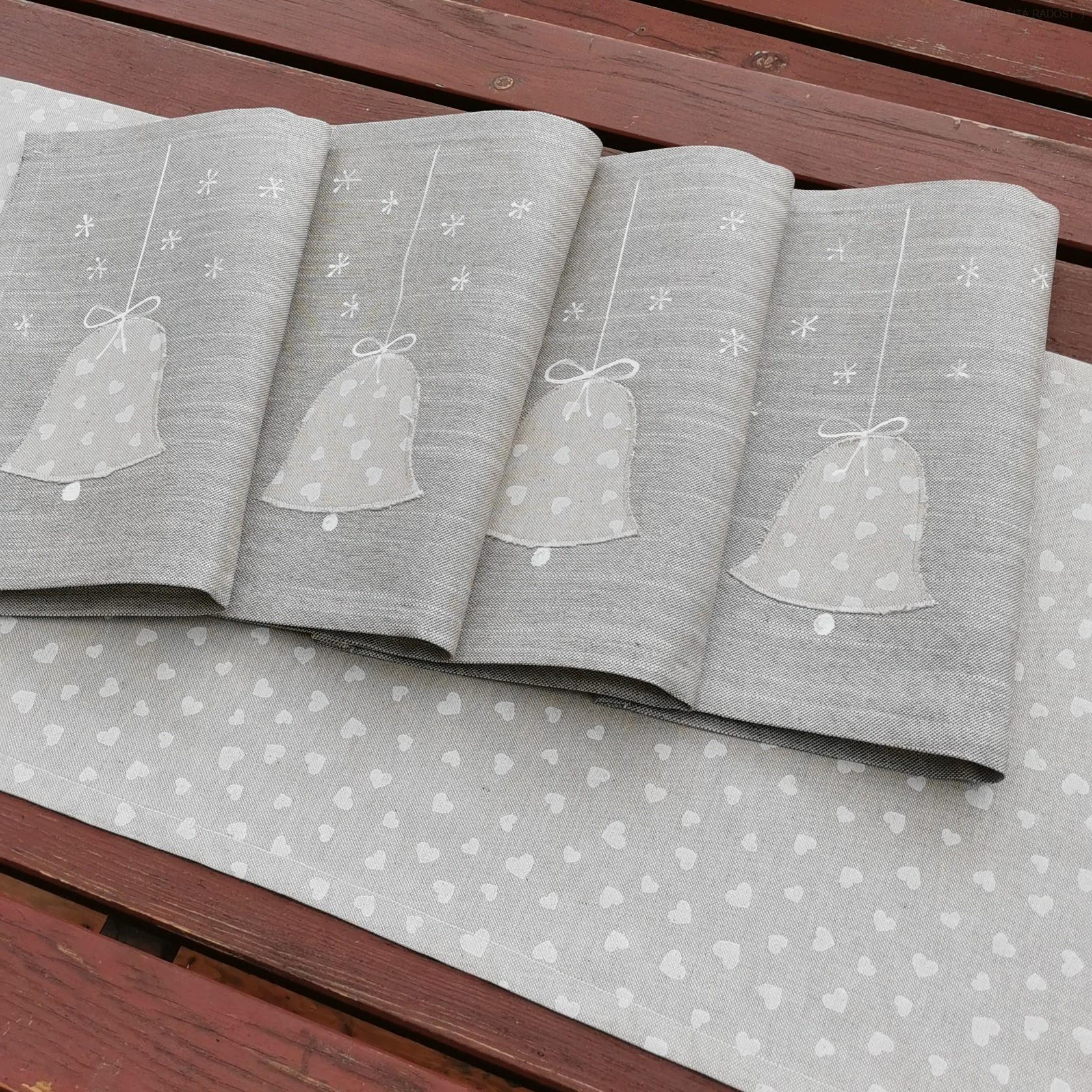 Běhoun a prostírání VÁNOČNÍ ZVONĚNÍ je autorská originální souprava na stůl s veselými domalovanými aplikacemi zvonečků.