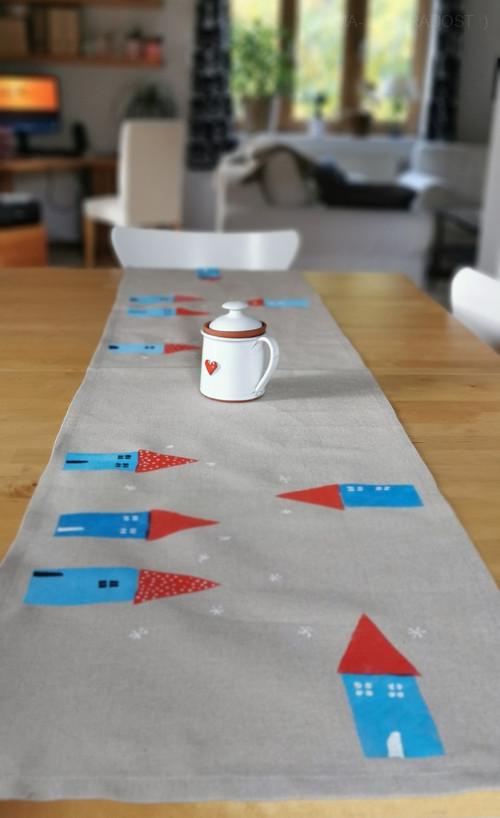 Běhoun ZIMNÍ DOMEČKY je ušitý z krásné silné režné látky s protkanými zlatými nitkami.