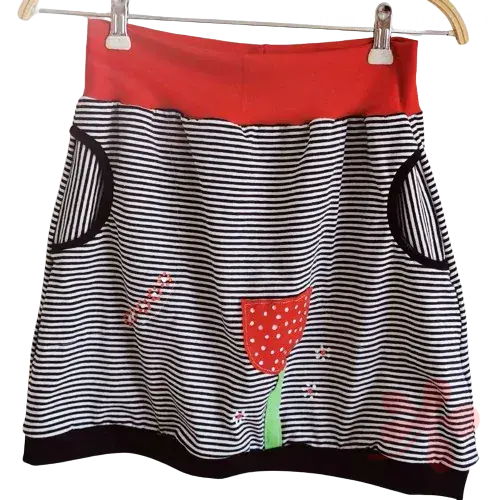 Dámská sukně PROUŽKOVANÁ PUNTÍKATÁ KYTKA je ušitá z bavlněného úpletu a je domalovaná textilní barvou.
