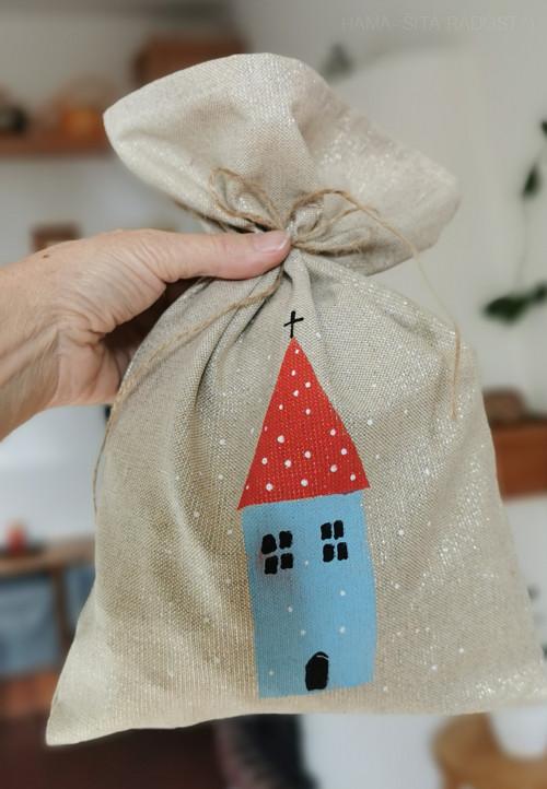 Dárkový pytlík domeček jsou ručně malované ušité ze silnější směsové látky se zlatými nitkami.