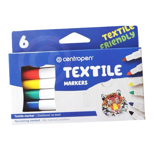 Balení fixů na textil obsahuje 6 základních barev: žlutou, zelenou, modrou, černou, červenou a hnědou.