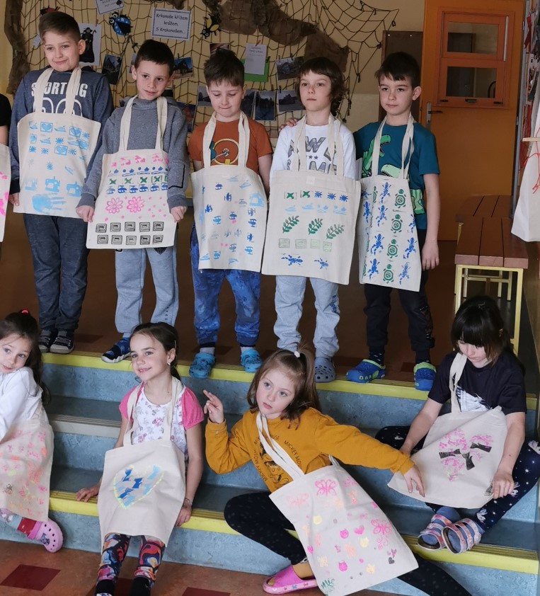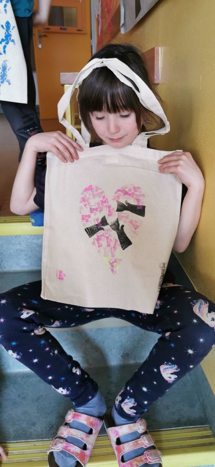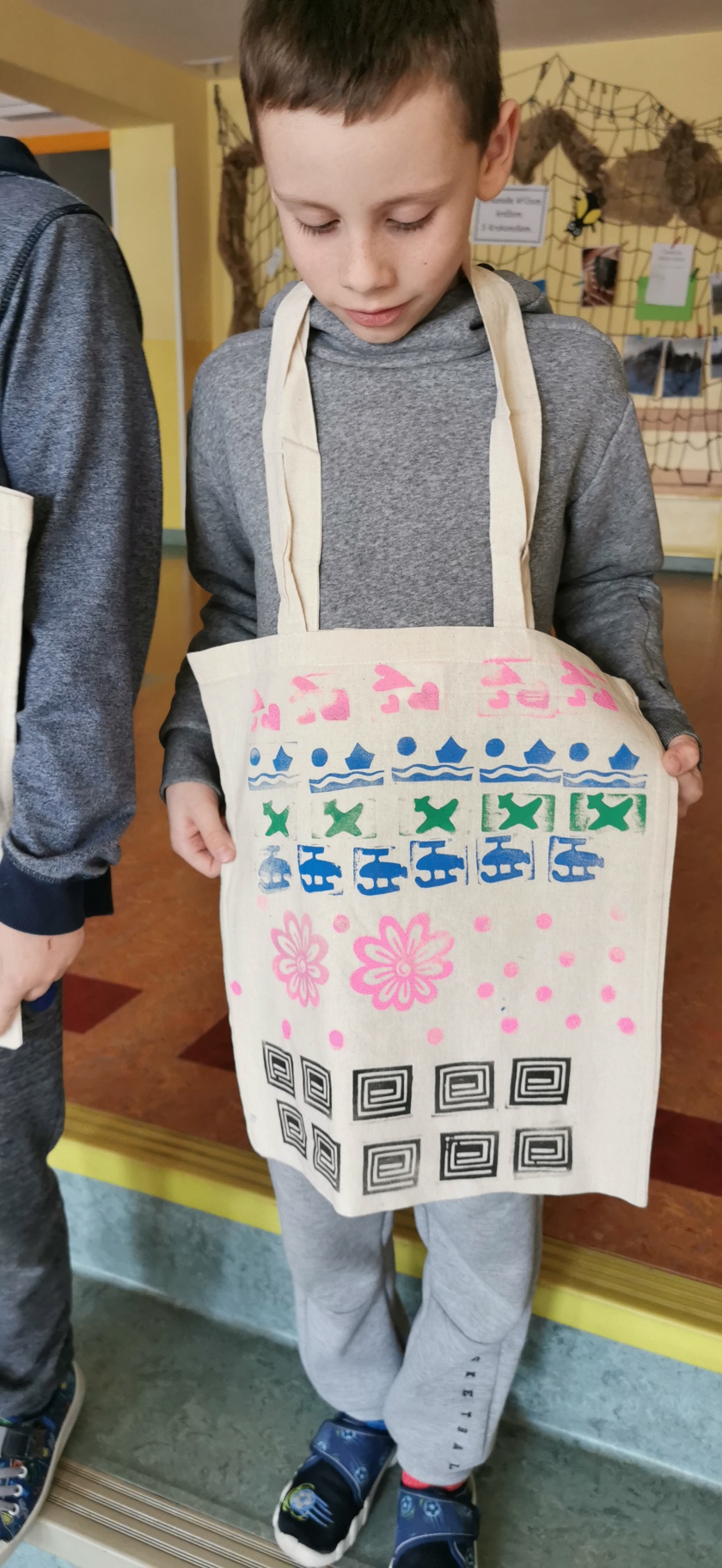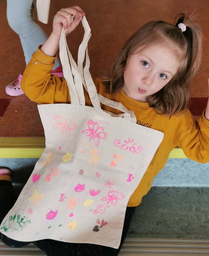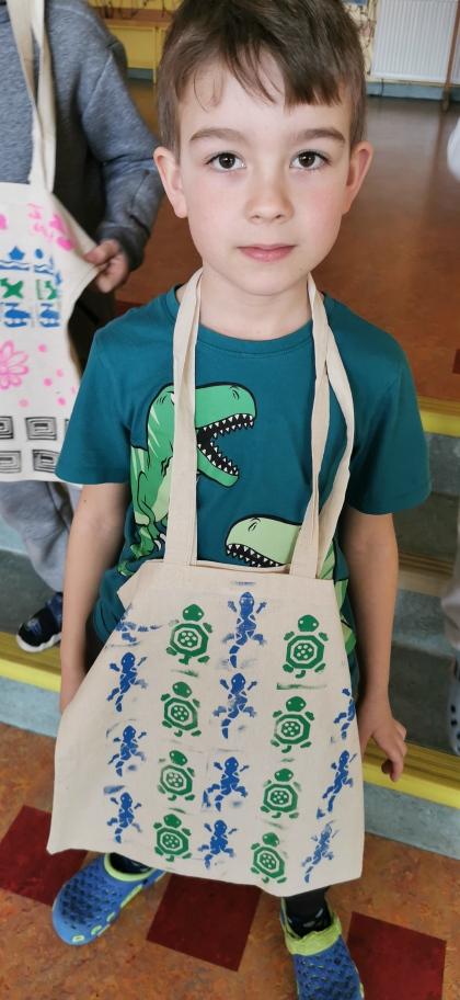 Inspirovala jsem děti vlastními taškami s přední potištěným předním dílem vlastnoručně vyrobenými razítky.