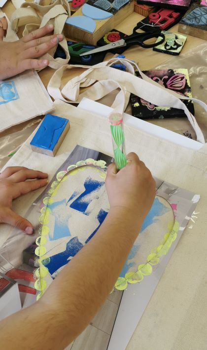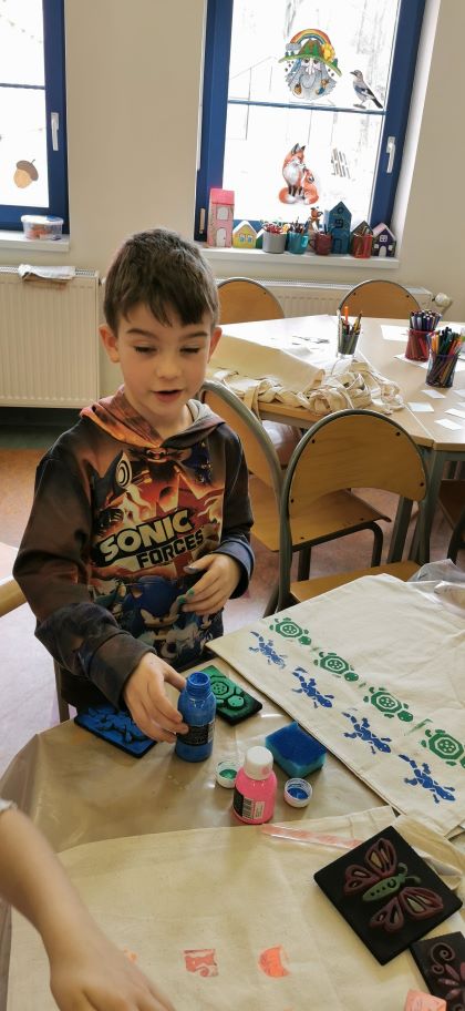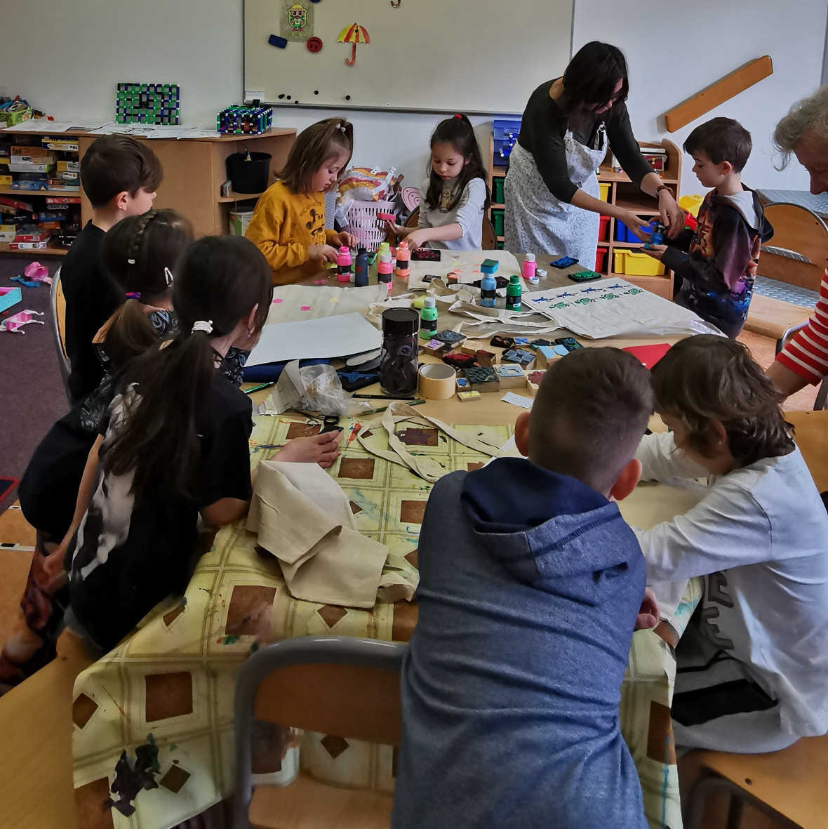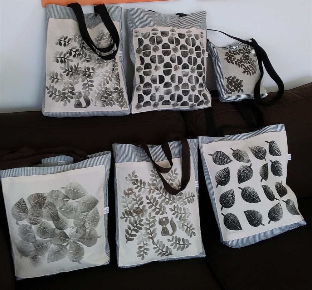 Inspirovala jsem děti vlastními taškami s přední potištěným předním dílem vlastnoručně vyrobenými razítky.