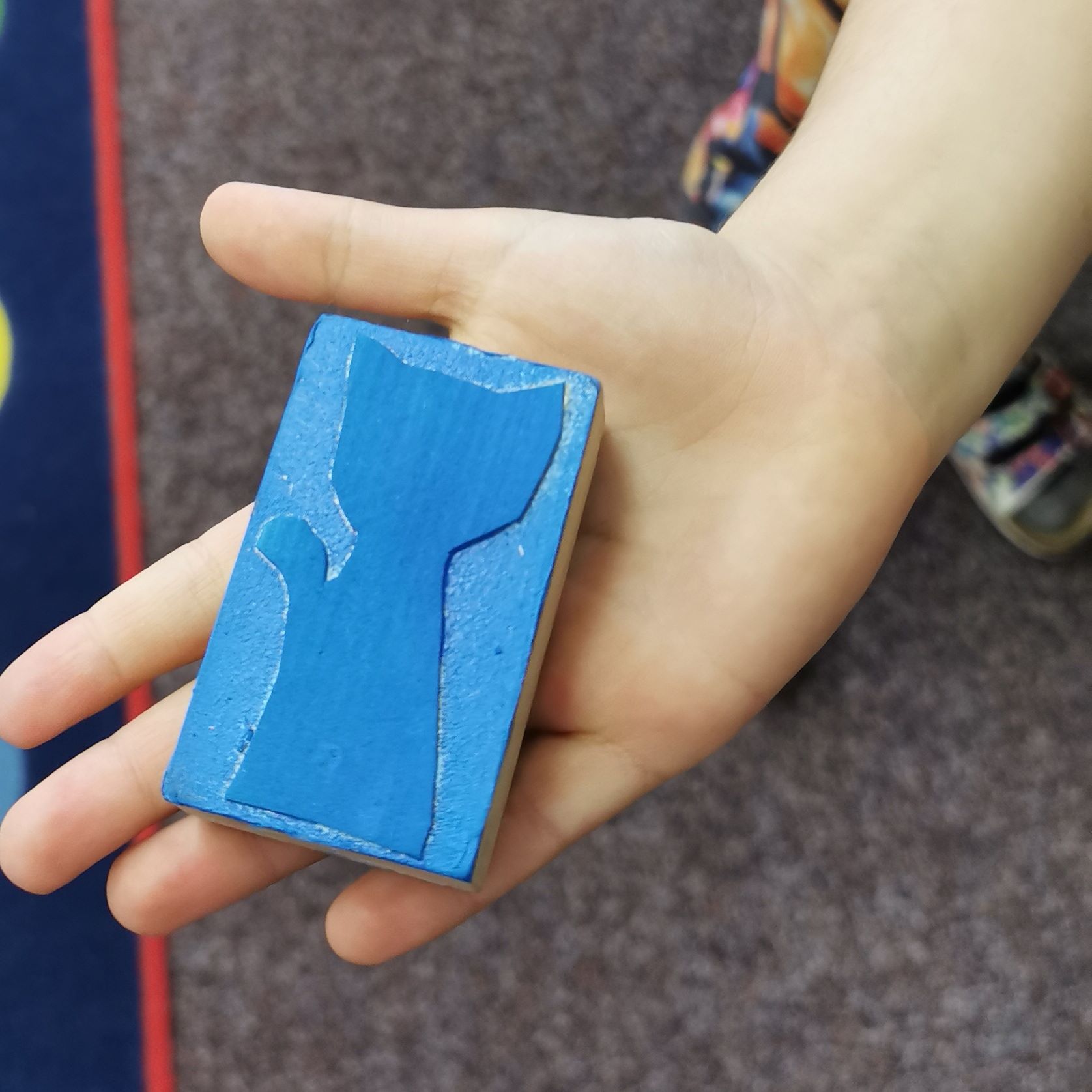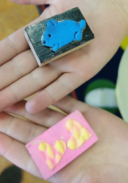 Na dřevěný špalíček jsem nalepila oboustrannou lepící pásku a děti si tužkou nakreslily obrys obrázku. Malými nůžtičkami obrázek vystřihly a na špalíček nalepily. Poté si vyryly do gumy detaily, jako třeba očička nebo vzorečky, tužkou, propisovačkou nebo malými nůžkami na nehty. Byla jsem překvapená, jak to skvěle zvládly. Jeden chlapec si dokonce nakreslil a vystříhnul vrtulník, jiný třeba plážovou krajinu s lodičkou:).Holčičky volily srdíčka a kytičky. Nejvíc bylo kočiček.