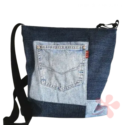 Kabelka sešívaná z různých džínovin má dvojitou kapsu a zapíná se na zip.