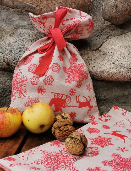 Tento látkový dárkový pytlík z režné přírodní látky s červenými vánočními motivy – stromky, vločkami, ozdobami a sobím spřežením – dodá vašim dárkům kouzelný vzhled.