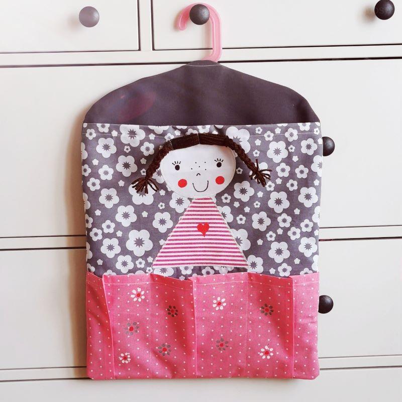 Pytel, kapsář na ramínko RŮŽOVÝ panenka TMAVOVLÁSKA je ušitý z pevnější silnější bavlny, zdobený je aplikací panenky.