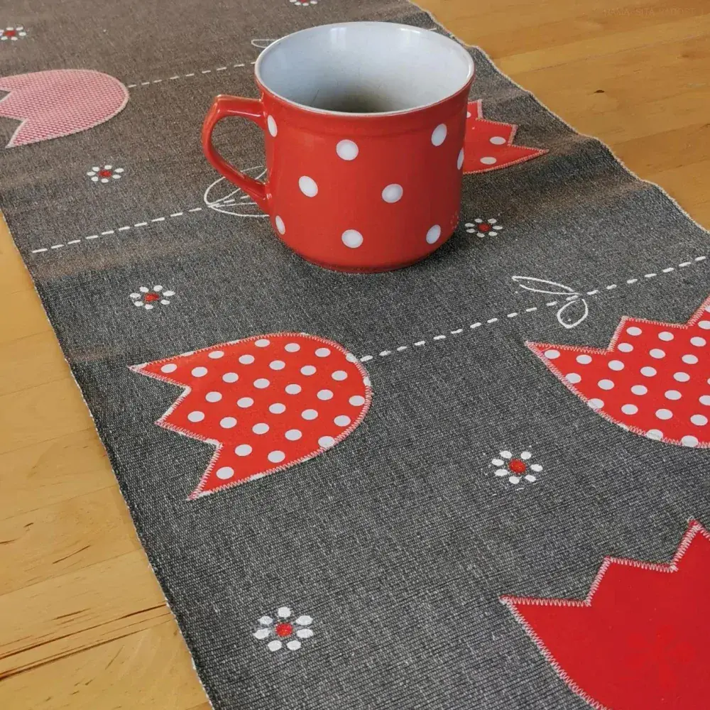 je ozdobený naaplikovanými tulipánky z veselých puntíkatých látek do červena.