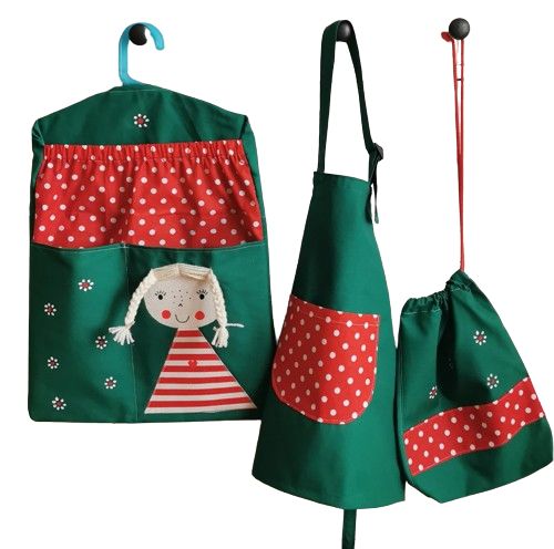 Skládá se z kapsáře na ramínko, zástěrky na tvoření a pytlíku na bačkorky.