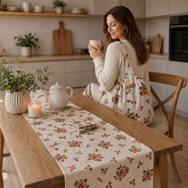 Šípková pohoda je kolekce doplňků do kuchyně z režné látky s lněným vzhledem, která přináší do domova klid, teplo a kousek venkova.