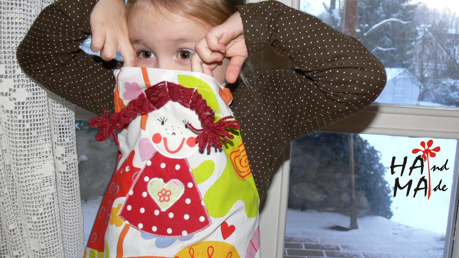 Panenka je moje kamarádka :). Mám stejné copánky jako moje panenka na zástěrce.