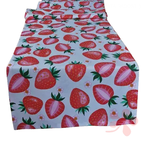 Ubrus, běhoun JAHODY na stůl je ušitý z krásného svěžího plátna s motivem velkých šťavnatých jahod.