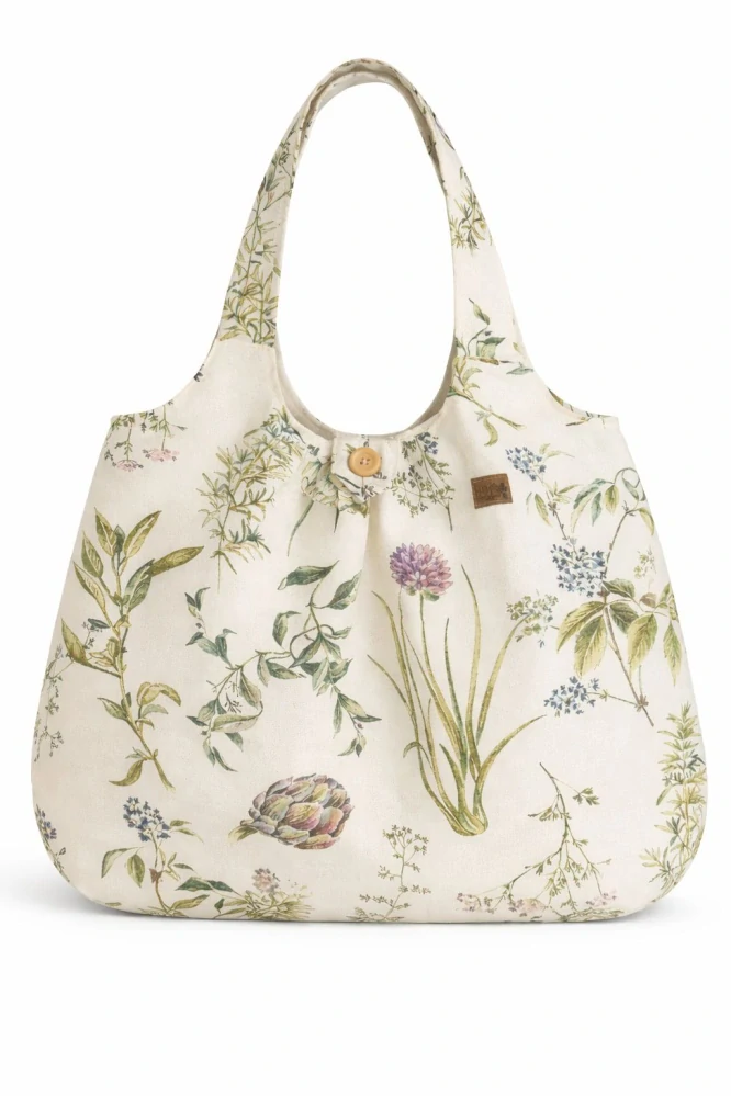 Velká taška letní louka je ušitá z krásné silnější režné látky s potiskem tráv a květin.