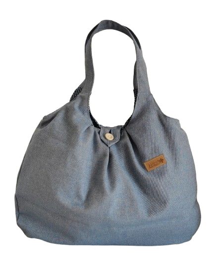 Velikost tašky: nejširší část 52 cm, výška 43 cm, délka ucha cca 52 cm, nosí se na rameni. Jedna dvojitá kapsa, poutko, knoflík.