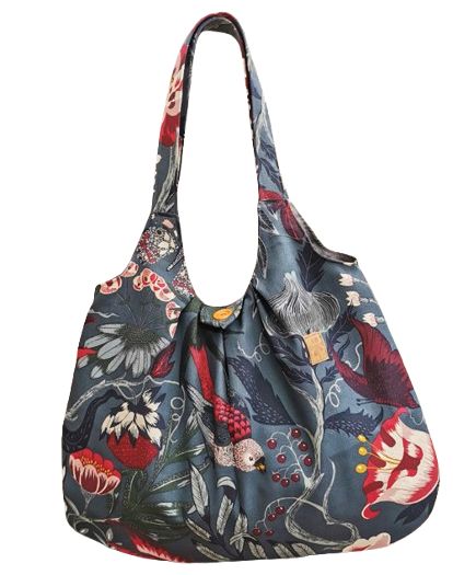 Velikost tašky: nejširší část 52 cm, výška 43 cm, délka ucha cca 52 cm, nosí se na rameni. Jedna dvojitá kapsa, poutko, knoflík.