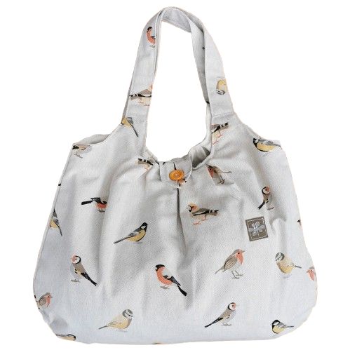 Zapínání na dřevěný knoflík dodává tašce přírodní šmrnc a zároveň drží obsah bezpečně uvnitř. Látka s jemným potiskem něžných ptáčků a větviček působí romanticky, lehce a zapadne do každého outfitu.