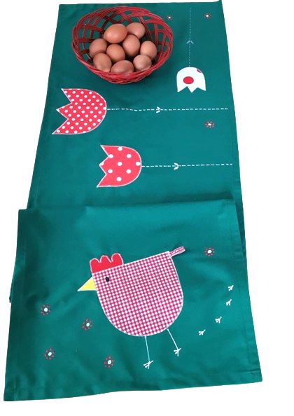 Zelený běhoun slepička červená je originální dekorace nejen na Velikonoce.